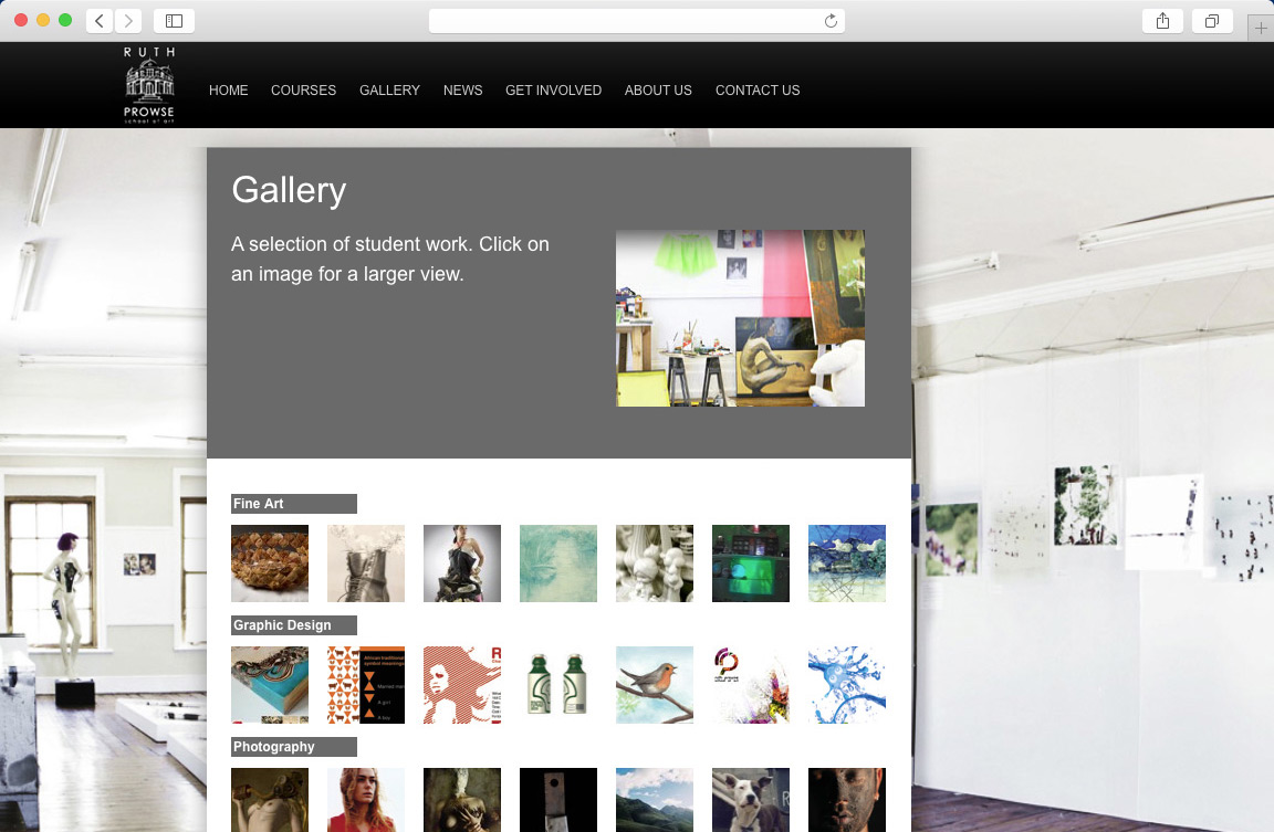 When Fireworkx was tapped by the Ruth Prowse School of Art to refresh their site, the objective became clear: like art, the site needed to be a showcase that drew visitors because of its visuals, but it also needed a commercial focus.